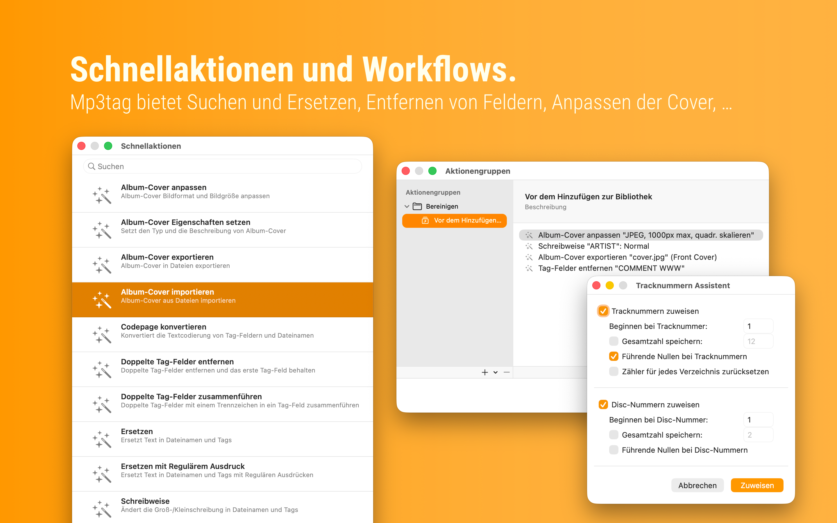 Da sich einige Aufgaben beim Verwalten einer digitalen Bibliothek wiederholen, können mit Mp3tag Aufgaben zu Aktionsgruppen zusammengefasst werden, die als Workflows per Klick abgearbeitet werden können. Beispiele sind das Formatieren von Tag-Feldern, Ändern der Groß-/Kleinschreibung, das Entfernen unerwünschter Felder oder das Anpassen der eingebetteten Album-Cover an die gewünschte Größen.